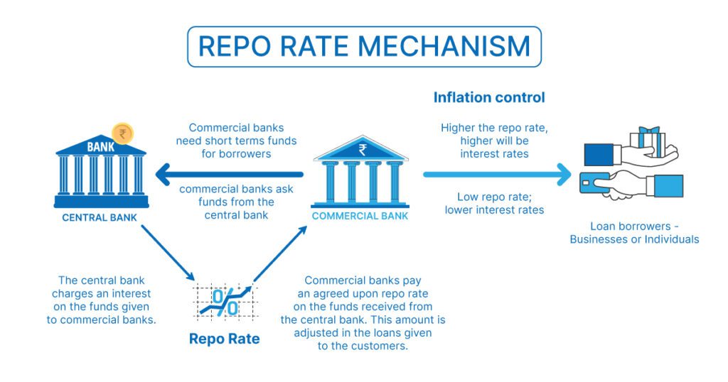 The repo rate, or repurchase rate, is the rate at which the central bank of a country (in India, it’s the Reserve Bank of India or RBI) lends money to commercial banks. This rate influences the interest rates that banks charge their customers for loans. When the central bank adjusts the repo rate, it can either increase or decrease the cost of borrowing money for banks, which is then passed on to consumers.